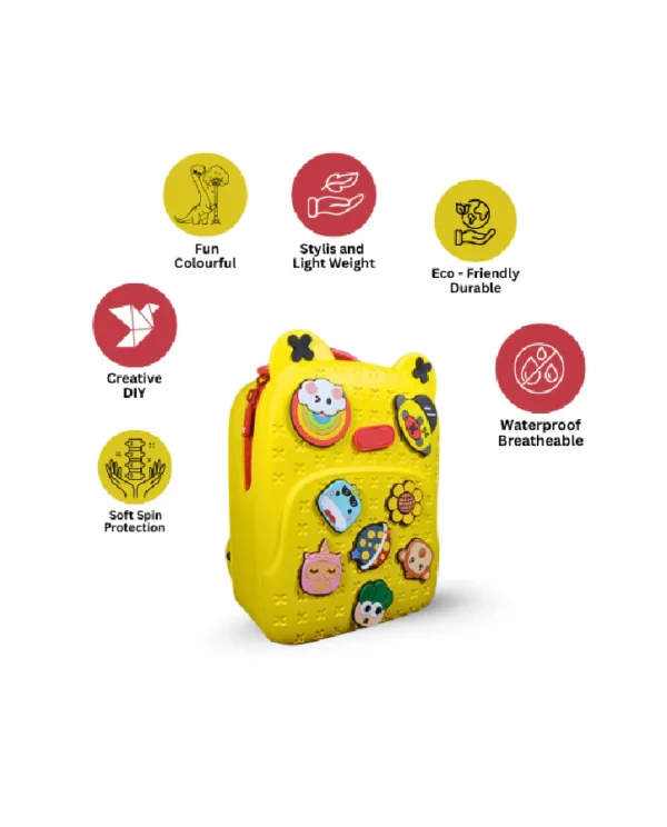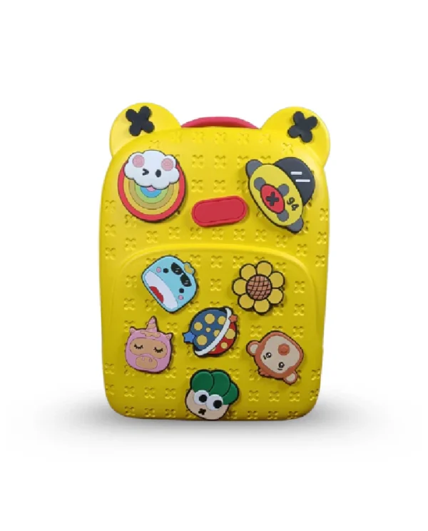 - Children backpack in a vibrant Blue color, featuring 8 eye-catching trinkets on the back that add a playful touch. It has bold design and striking color combination. The bag also features a unique, high-quality double-strip opening zipper for added style and convenience.