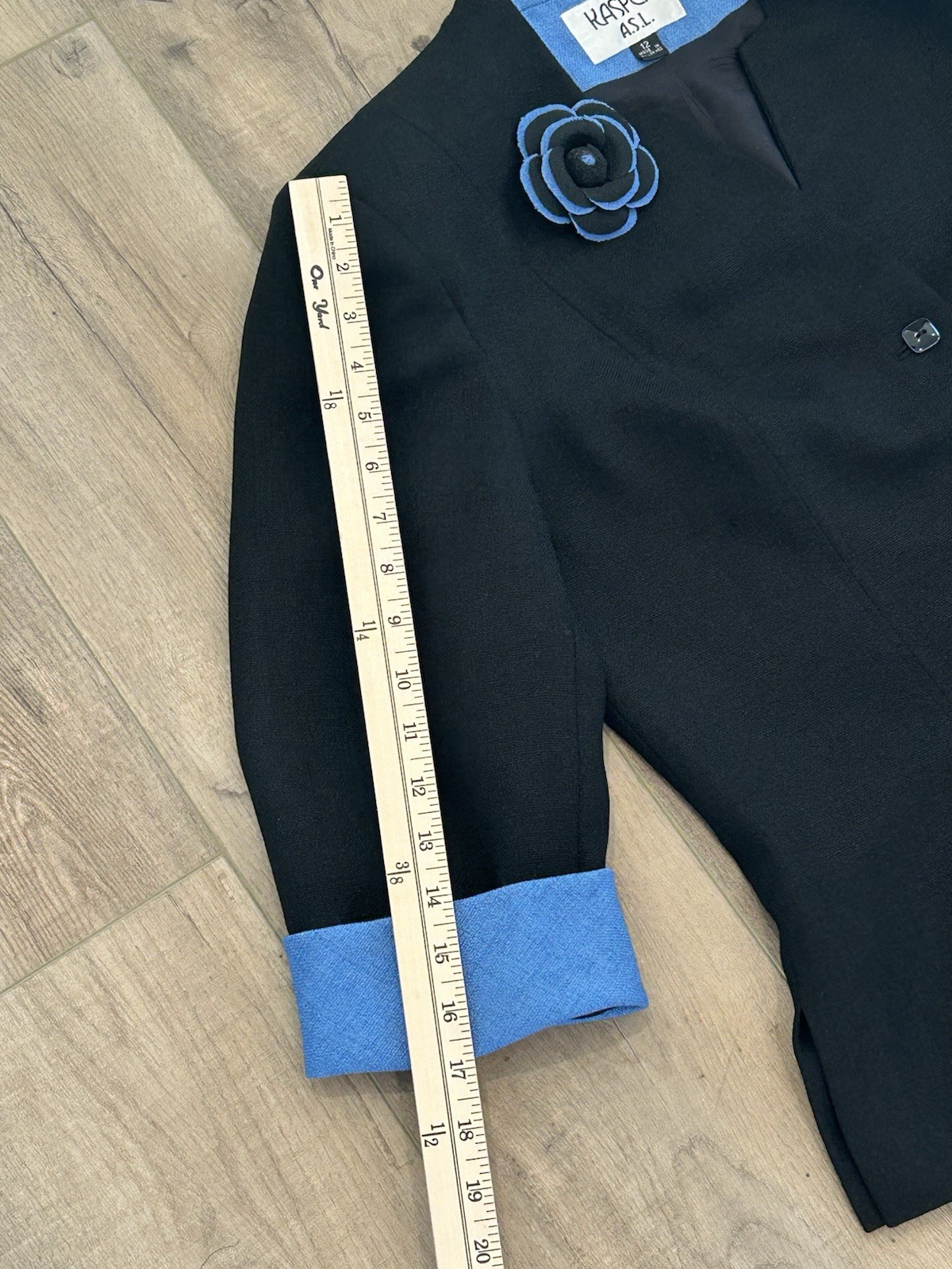 The KASPER ASL 2Pc Skirt Suit is a stylish and sophisticated outfit perfect for business or formal occasions. This black and blue suit features a skirt and a jacket with a detachable floral pin, adding a touch of elegance to the ensemble. Made from a blended fabric and fully lined this suit is both comfortable and luxurious. The jacket has a notch lapel, bracelet length sleeves with flip cuffs and a three-button front closure, while the skirt is designed for a regular fit. Perfect for any season, this suit exudes a classic and preppy style ideal for the modern woman.Please see photos for measurements